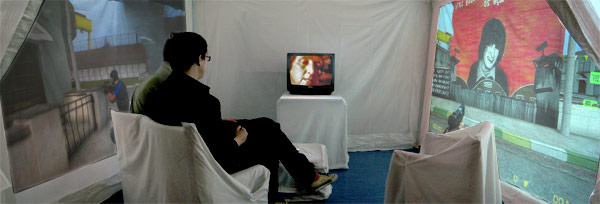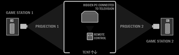 The game is projected on two translucent sides of a white tent. There are two accompanying player interfaces outside the tent, one for each team. The television and remote control are situated inside the tent, where the reverse of the outside projections is also visible.
