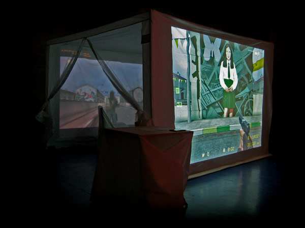 Block H is an interactive installation comprised of two parts. Its name originates from The Maze/ Long Kesh prison and H-Blocks that held paramilitary prisoners up until recent times. The housing estate (Block H) featured in the Counter-Strike mod presents a comparable sense of confinement. This video game world simulates the outside environmental influences of Northern Ireland such as sectarian murals, while