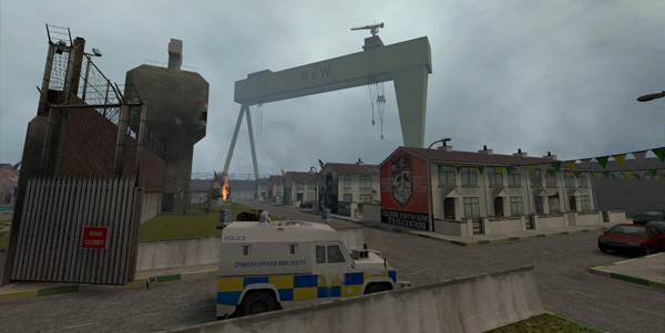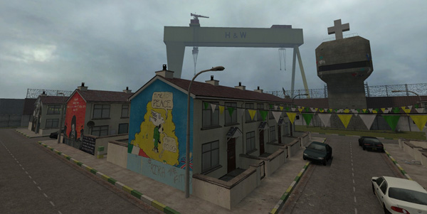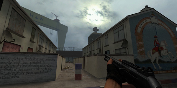 The game uses a first person perspective multiplayer engine. it is a Counter-Strike Source mod which can be played on a local network or over an internet connection. Teams are split into Loyalist and Nationalist. Players wear Celtic and Rangers jerseys, denim jackets and anoraks. They are situated in a housing estate split by a peaceline and watchtower. Each side has its own versions of sectarian symbols: murals, bonfires, flags, drums, graffiti etc. Details were based on hundreds of reference images to create a composite environment of Belfast and Derry.